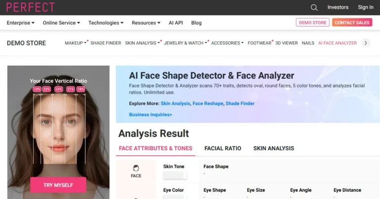 If you want to go deeper than a basic face score, MakeupAR’s Face Analyzer is an option. It uses advanced AI that’s been trained on tons of data. After you upload a photo, it looks at everything: the shape of your entire face structure. It then compares all these measurements to ideal proportions, including the golden ratio, to show you how balanced your features are. What really makes it stand out are the detailed explanations.